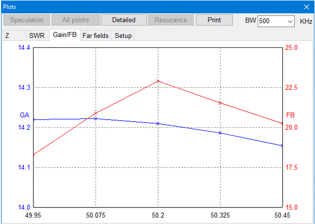 Plots MMANA-GAL and impedances from 49.95MHz to 50.45MHz